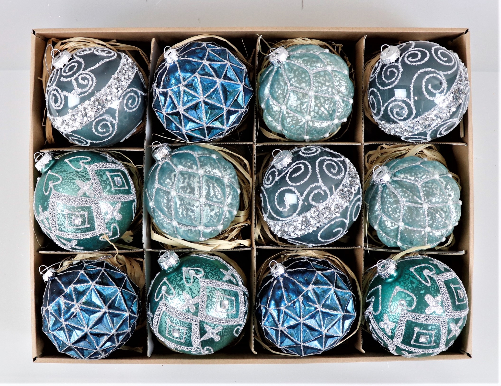 **SEO-relevant keywords**: Vintage glass baubles, Christmas decorations, shades of blue and silver, stationary retail, home & lifestyle, festive decorations, Christmas tree decorations, nostalgic Christmas accessories.