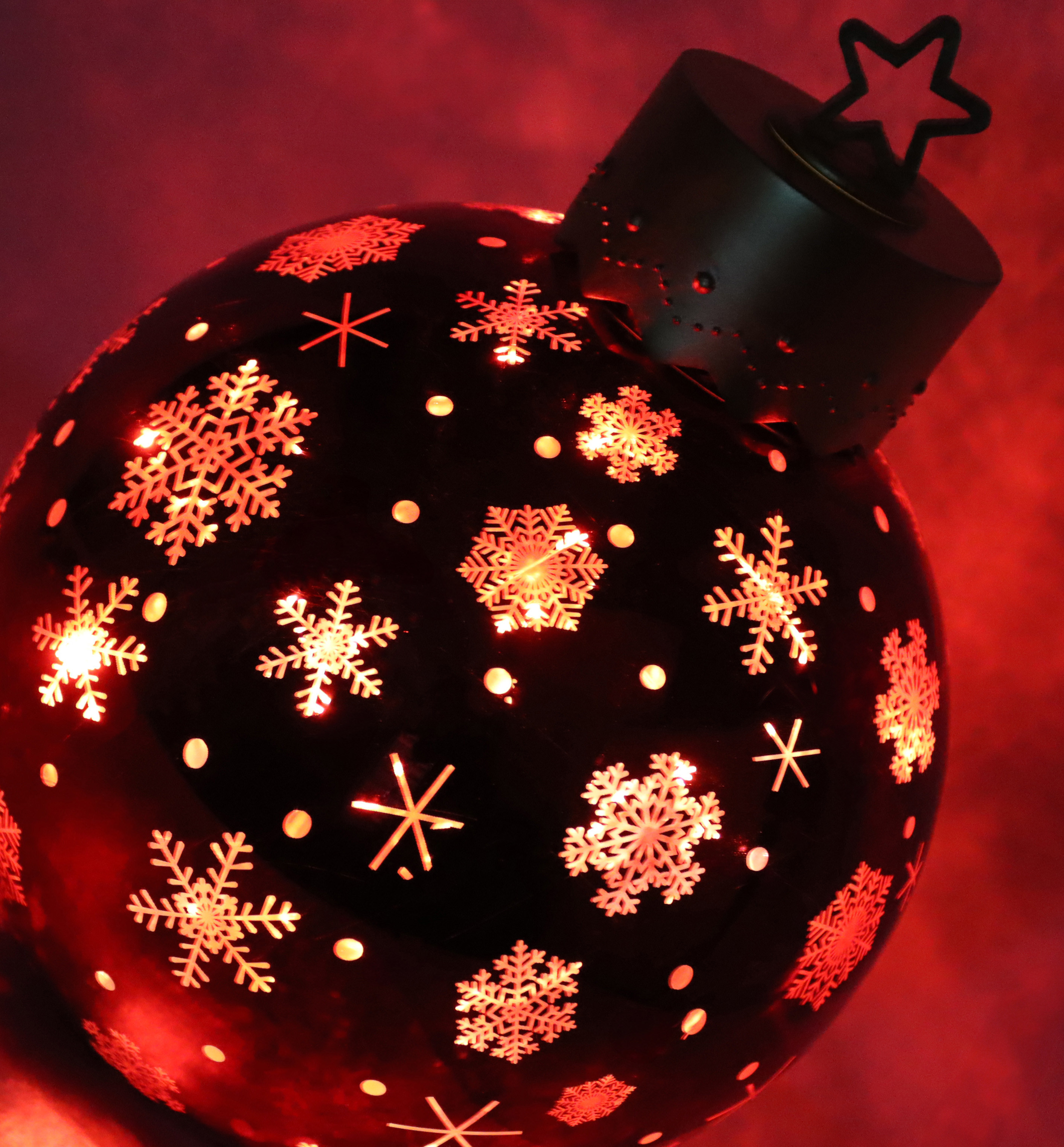 The "Snowflake" LED light ball is made of high-quality glass and robust plastic, which emphasises its durability and resistance. The ornate red sphere is decorated with shimmering snowflakes that create a cosy and inviting feeling in any setting. The integrated LEDs provide a warm, atmospheric light that will make your window display stand out and create a cosy atmosphere that will attract shoppers.