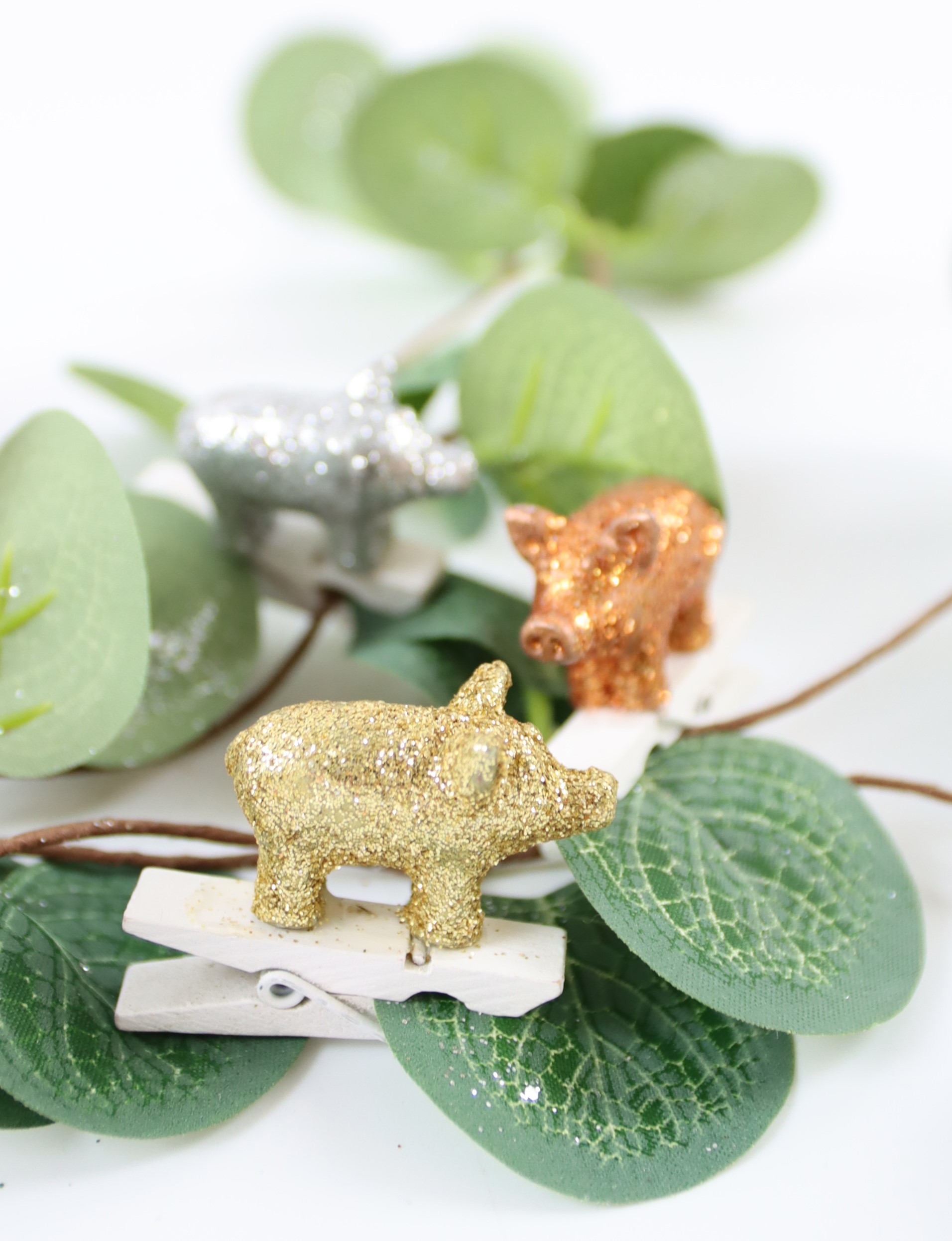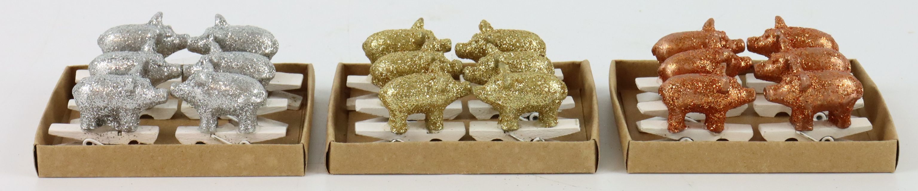 Designed for modern stationary retail in the home and lifestyle sector, these staple Christmas decorations are a bright and sparkling eye-catcher in any Christmas collection. For generations, Christmas has been a time for embellishment, and no detail is too small to be overlooked. The "Glory Pigs" clip charmingly offers a unique way to embellish any Christmas decoration with a special touch.