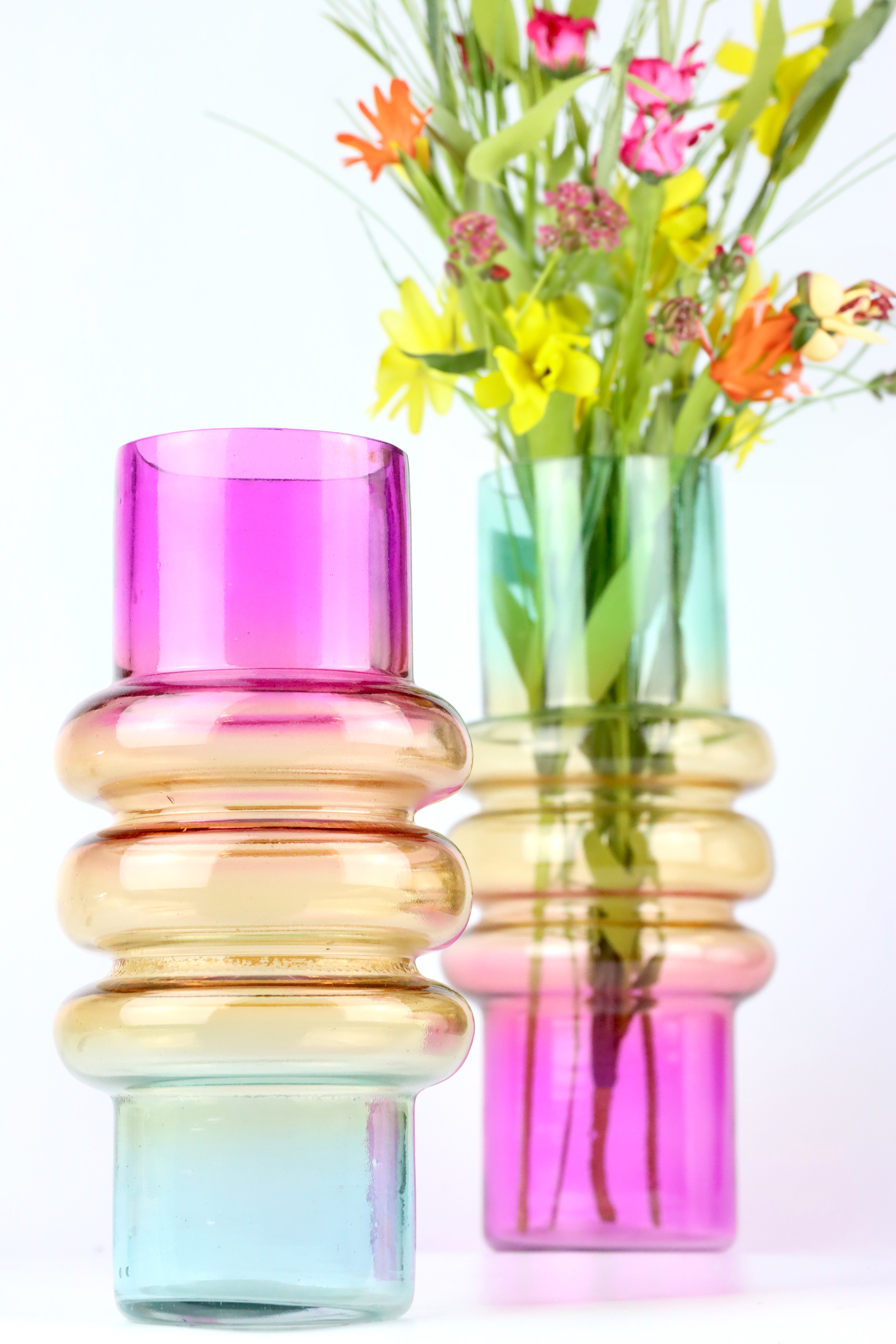 The 2-piece set consists of two vases in different sizes - approx. 19 cm and 23 cm - which combine beautiful design and functionality. Each vase has been crafted with the utmost care and features a vibrant multicolour design that literally catches everyone's eye. The harmonious colour gradient makes these vases the perfect centrepiece for any living environment, whether on an elegant dining table or as a highlight in the entrance area.