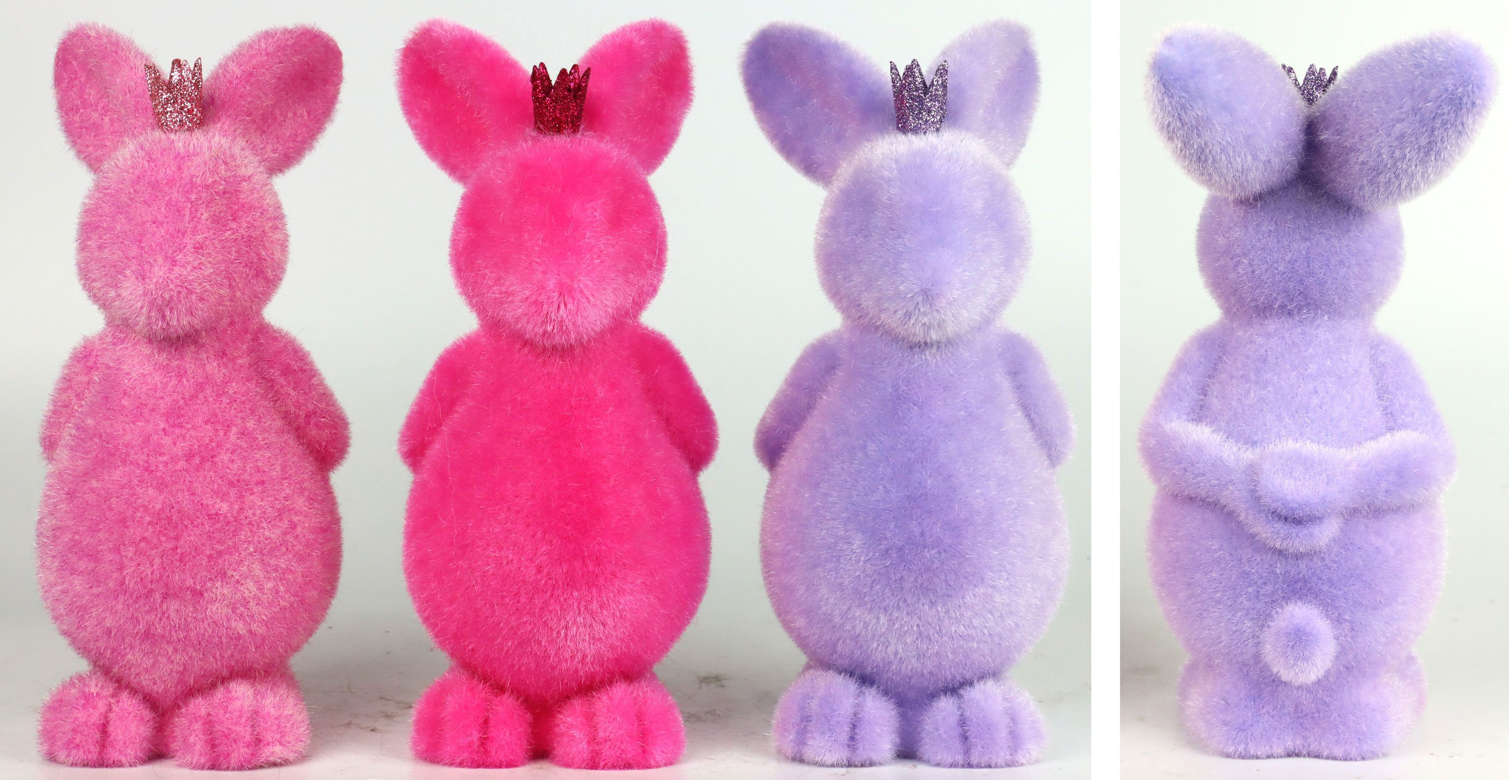 Discover the enchanting 3-piece bunny set "BUNNY FLOCAGE" for Easter - a stylish accessory for stationary retail in the home and lifestyle sector. This charming bunny set, consisting of three skilfully crafted bunny figures in vibrant shades of pink and purple, is the perfect eye-catcher for your spring and Easter collection. Made from high-quality plastic, the bunnies feature a fine flocage surface that gives their look a velvety texture. With a height of approx. 23 cm, the bunnies are ideal for creating colourful and inviting decorations in shop windows, on shelves or on counters.