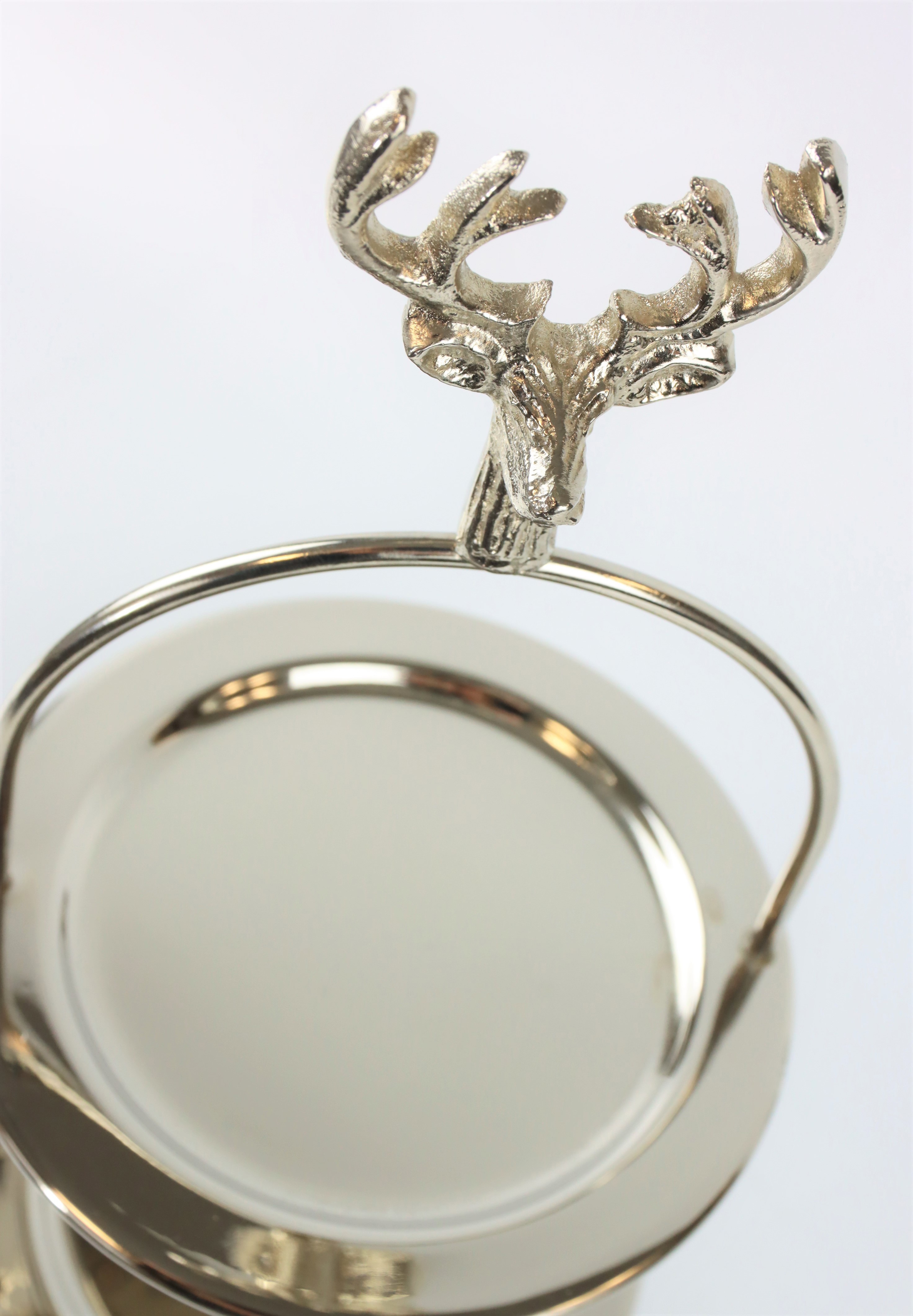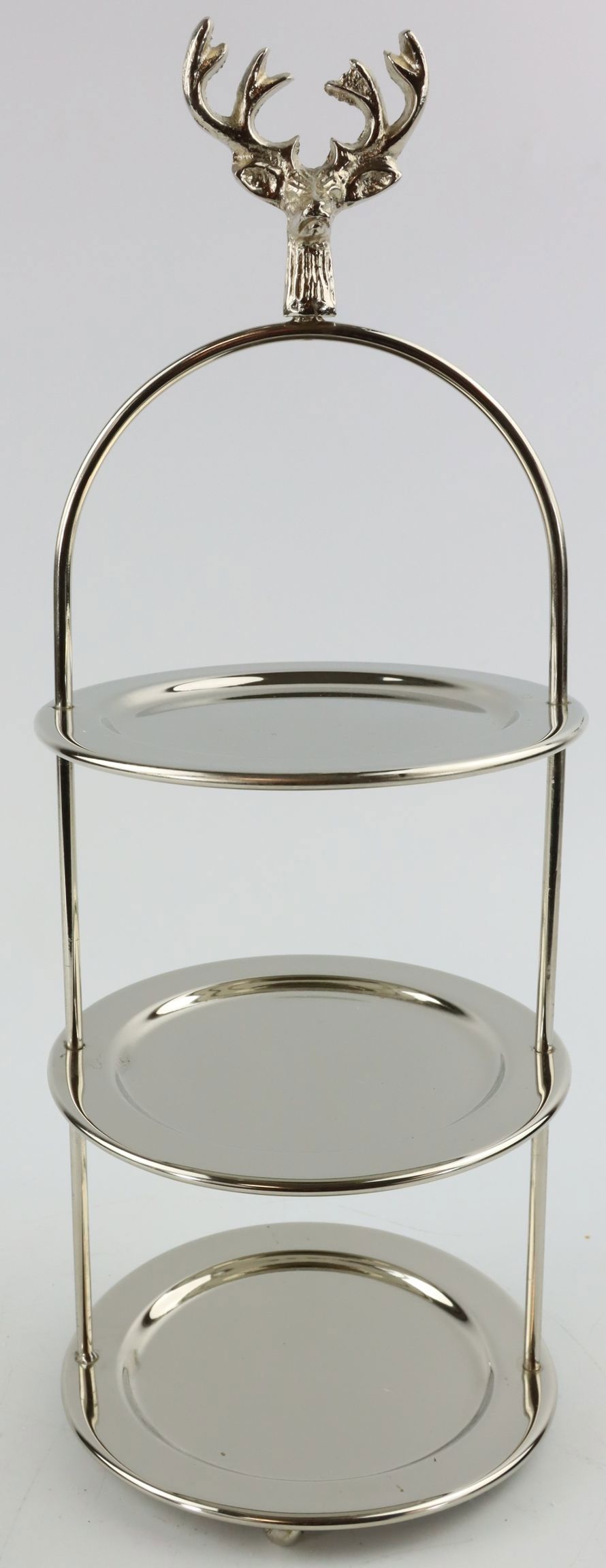 - **Unique design:** Three-tier etagere with expressive stag's head in elegant silver.