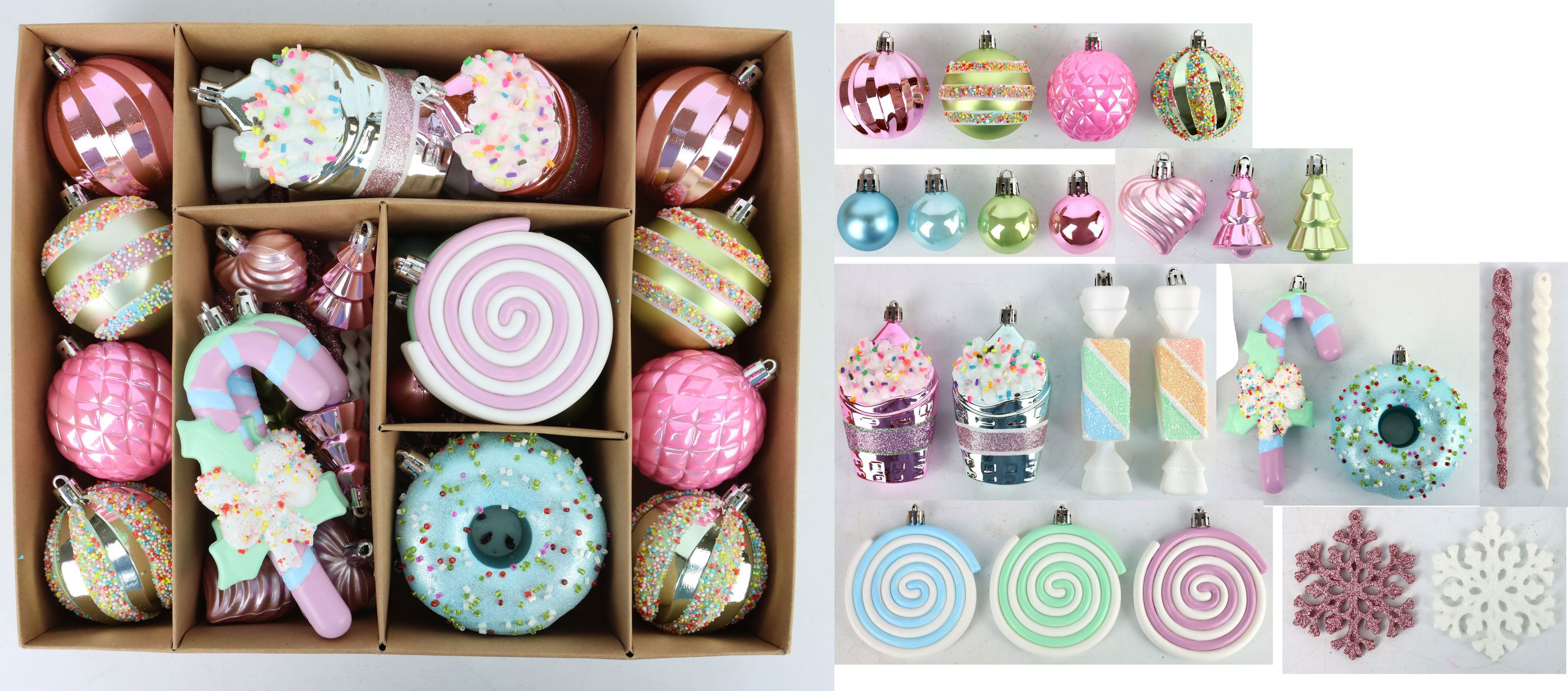 ENDiscover the magic of Christmas with our "COSY&CANDY" S/48 baubles assortment! Whether you want to add an eye-catching touch to your Christmas tree or add a special accent to your Christmas display, our 48-piece Christmas tree ornament bauble assortment has everything you need. The item number is 9422.