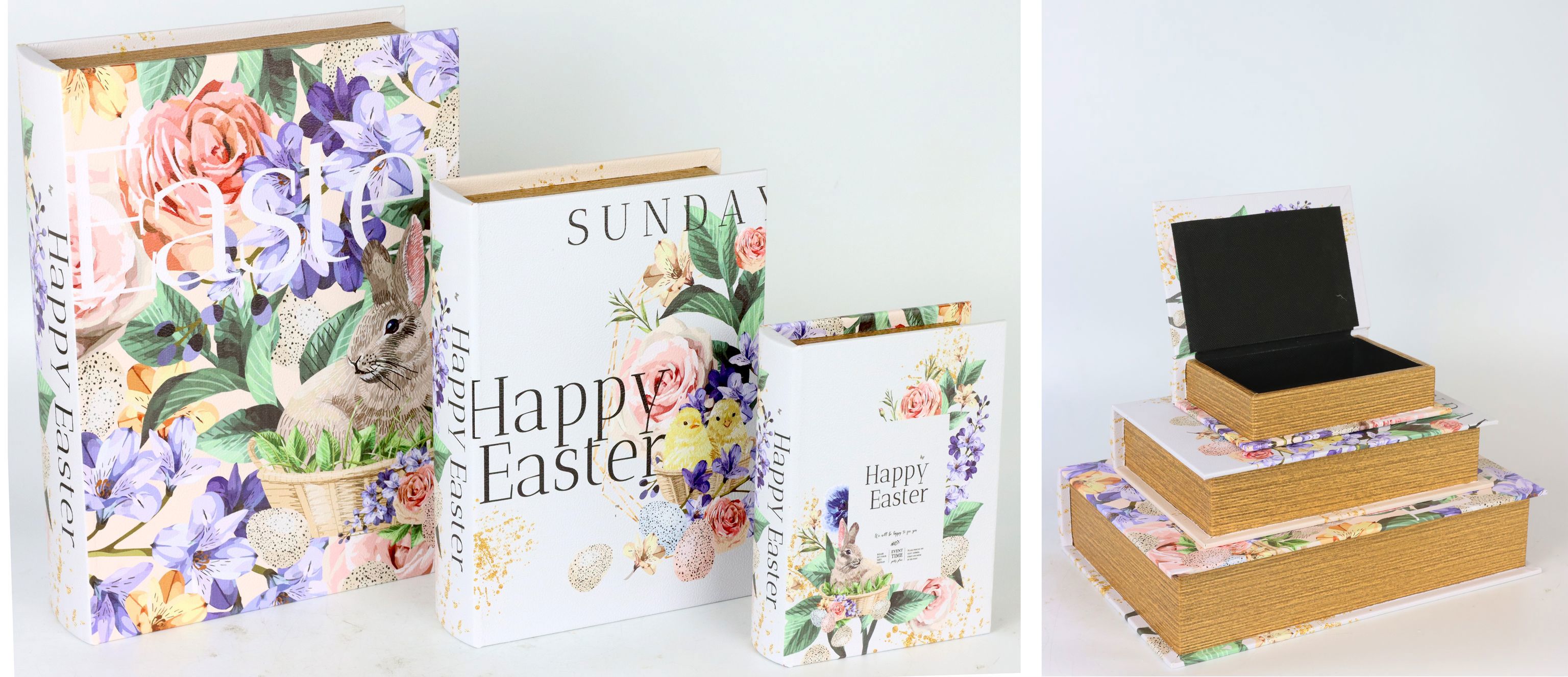 Añada ambiente a su tienda en Semana Santa con el elegante juego de folios "FELIZ PASCUA". Este set de cajas decorativas con forma de libro combina elegancia y funcionalidad y ofrece una solución ideal para almacenar y decorar. Fabricado en madera de alta calidad y diseñado en un clásico color blanco, el set combina el uso práctico con el encanto estético y atrae a los clientes que aprecian los artículos inusuales para el hogar y el estilo de vida.