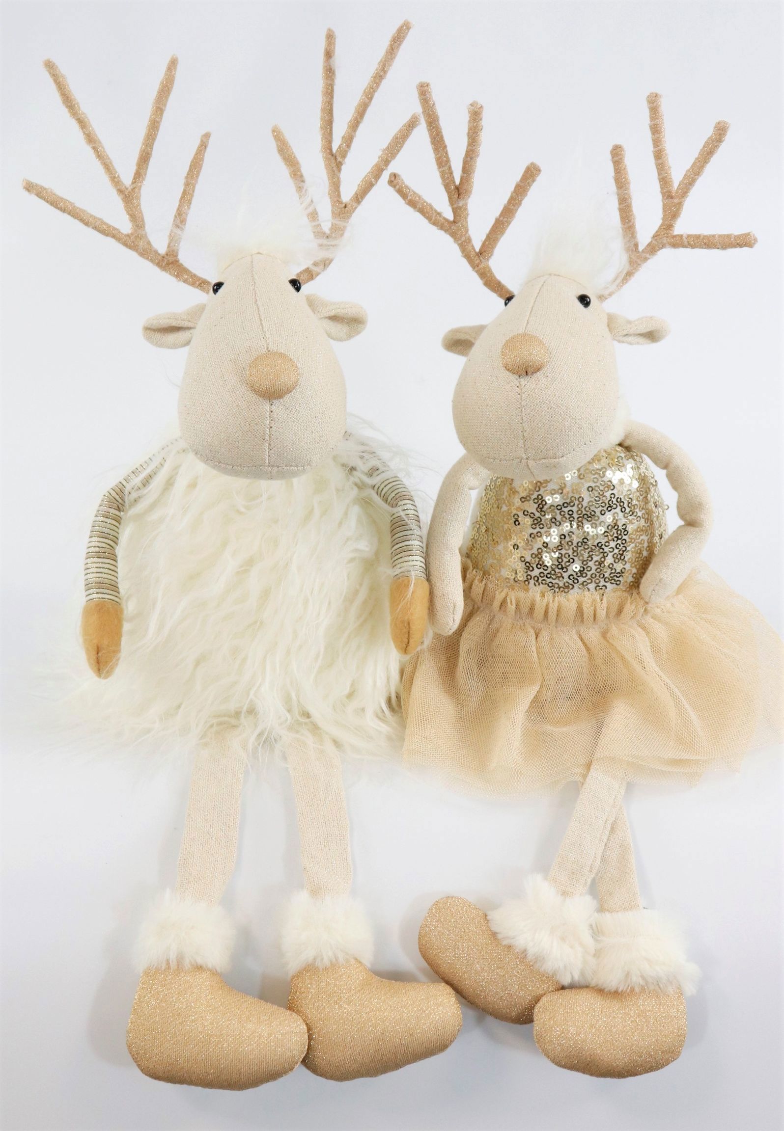 Enriquece el ambiente de tu espacio de venta con la elegante pareja de alces "Golden Dust", una pieza imprescindible para la próxima temporada navideña. Este exclusivo conjunto de dos alces de diseño ornamental aporta un toque de lujo y magia festiva a cualquier hogar y espacio de venta de estilo de vida. Con su impresionante altura de unos 49 cm y la elegante combinación de colores crema y dorado, la pareja de alces es todo un reclamo que hará las delicias de sus clientes.