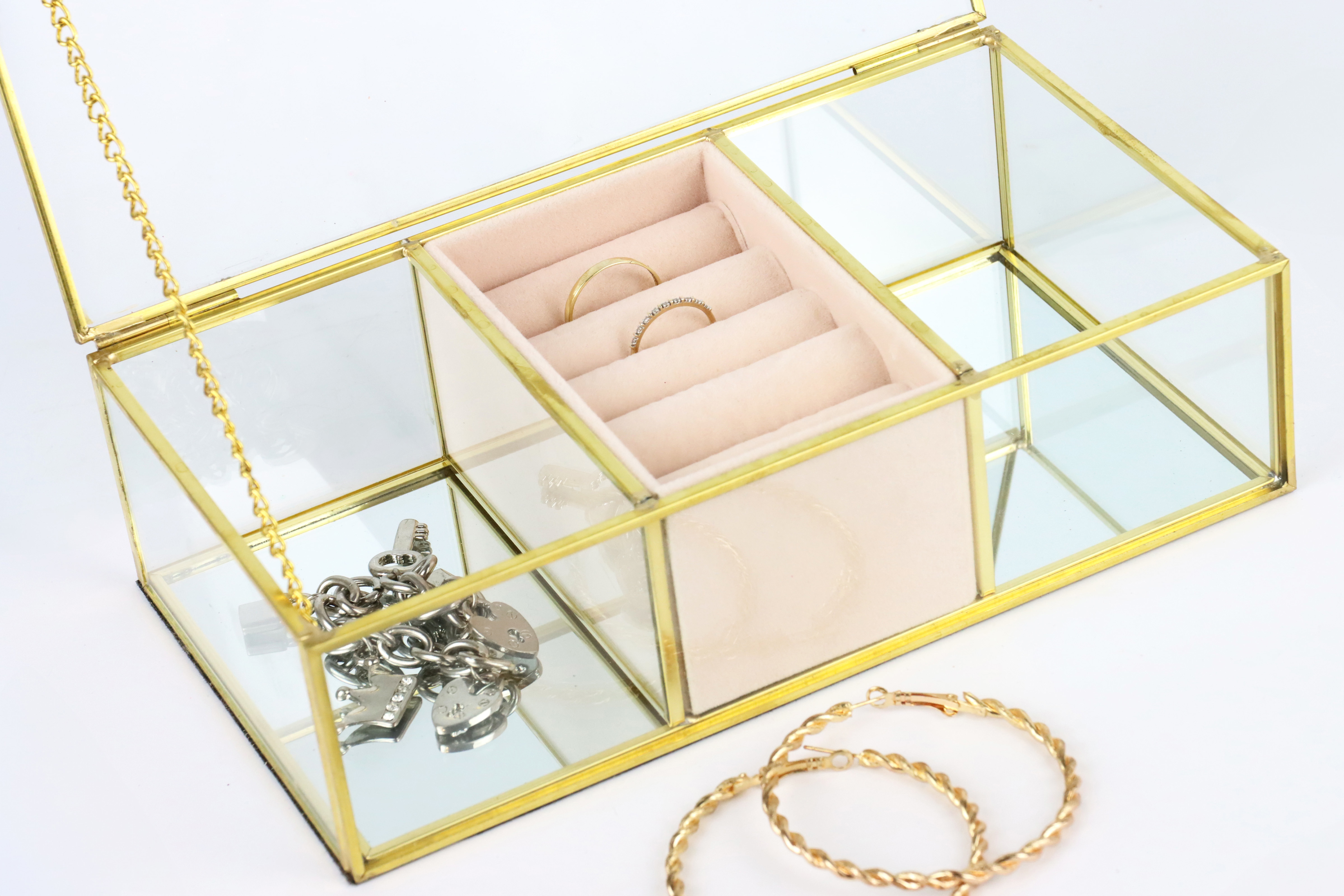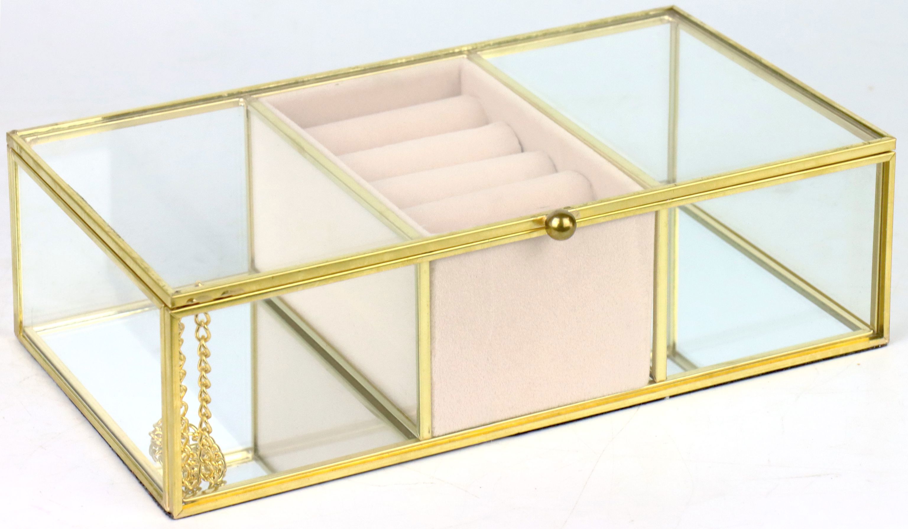El diseño con el sutil pero llamativo borde dorado confiere al joyero una elegancia atemporal que encaja tanto en interiores clásicos como modernos. La combinación de transparencia y aspecto dorado hace que el joyero resulte especialmente elegante y atractivo, lo que puede aumentar la predisposición de compra de sus clientes.