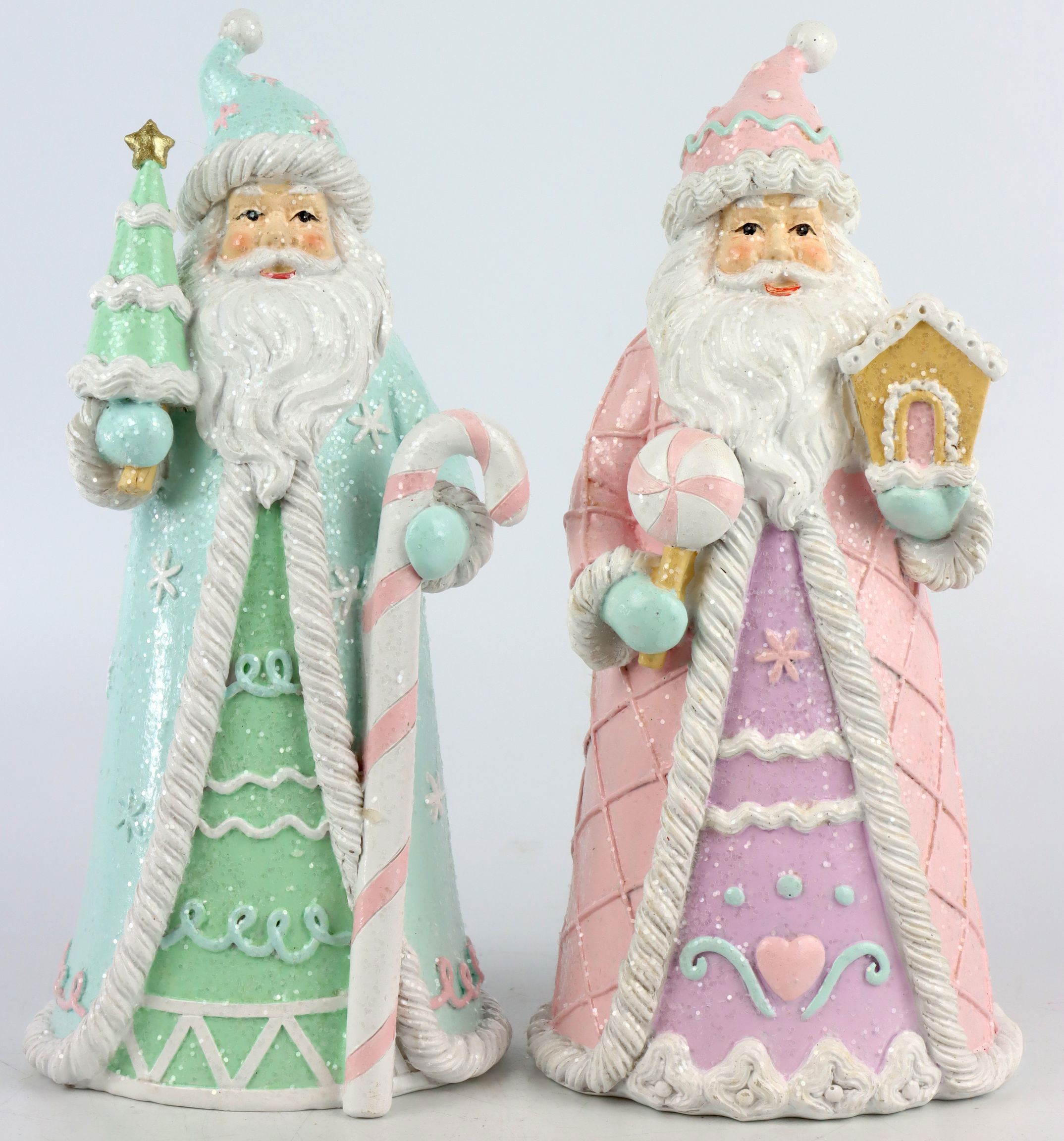 Los Papás Noel "Candy Xmas" son un encantador conjunto de 2 figuras que darán vida a cualquier decoración navideña. El color pastel -una refrescante mezcla de turquesa y rosa- imita la dulzura de los bastones de caramelo y confiere a estas figuritas un aspecto único y llamativo.