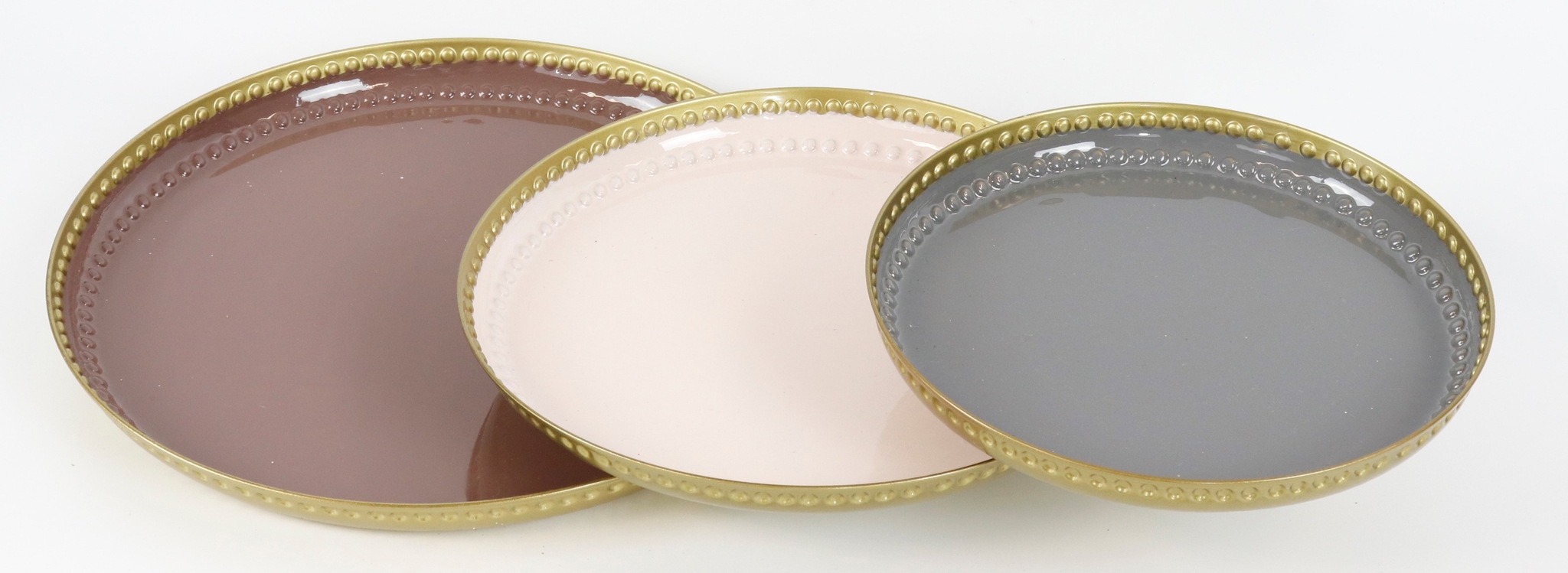 Estos bellos boles bandeja impresionan con un armonioso juego de colores en marrón, rosa y gris. Fabricados en metal robusto, no sólo atraen todas las miradas, sino que también son especialmente duraderos. Los diferentes tamaños con un diámetro de 31 cm, 25,5 cm y 21,5 cm permiten una gran variedad de usos y convierten el conjunto en un accesorio versátil para cualquier interior.