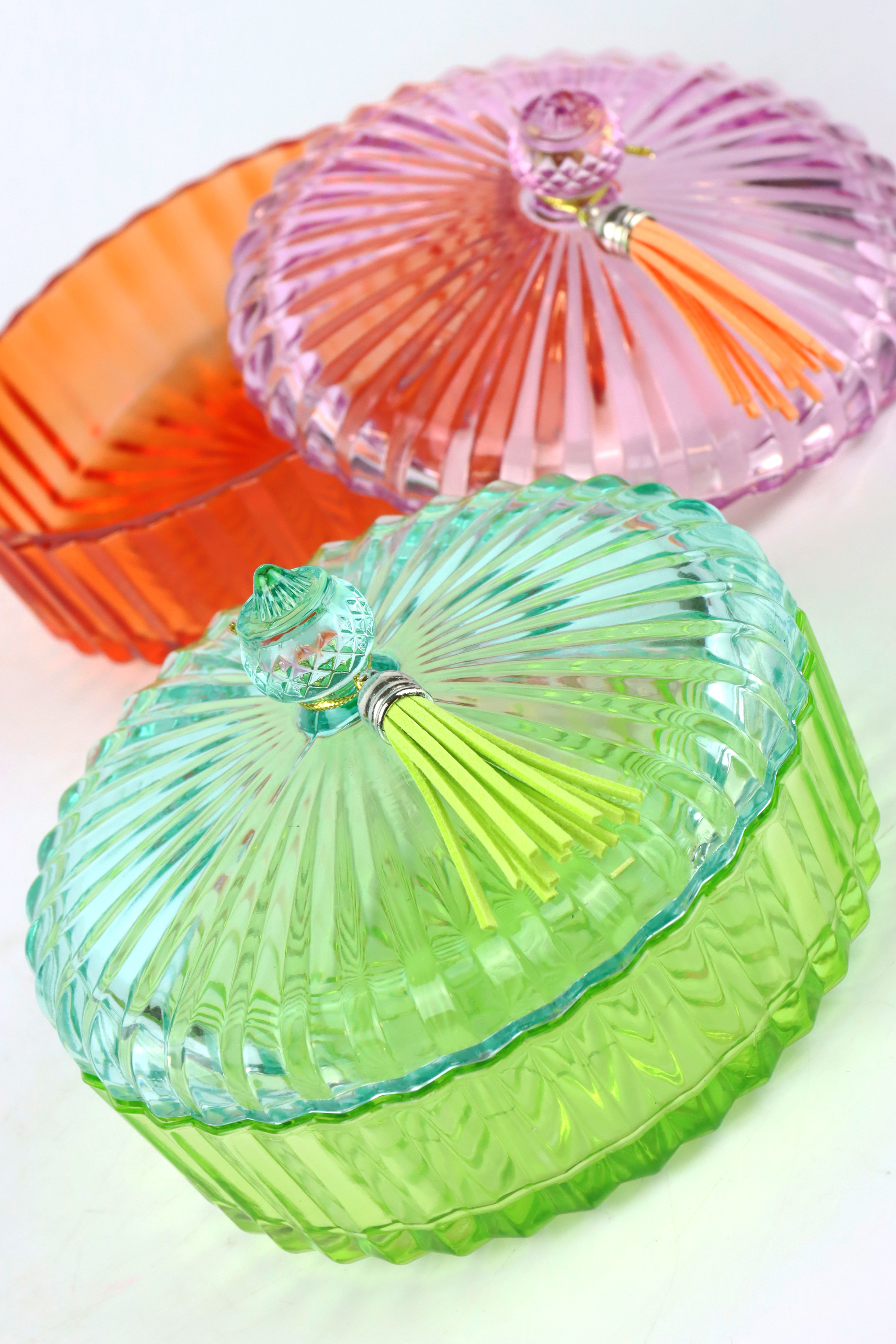 - **Set de trois pièces:** Trois boîtes en verre colorées d'environ 14x8 cm pour une utilisation polyvalente.