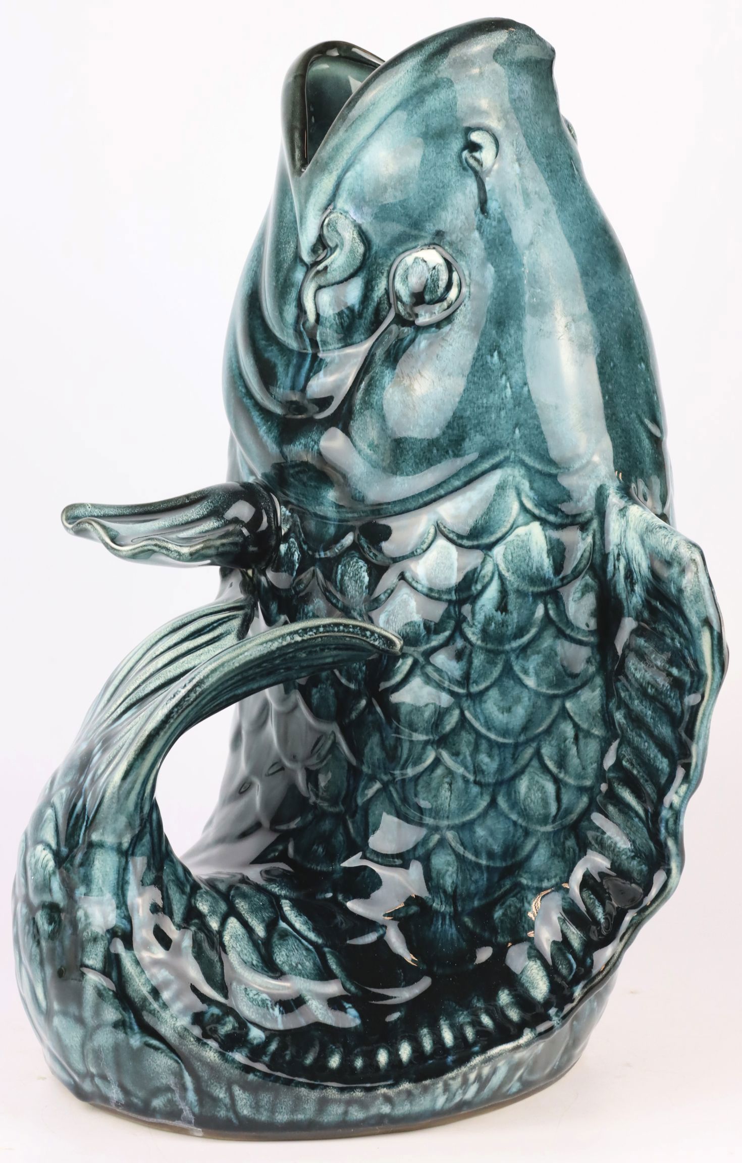 Le vase "Lucky Fish" impressionne par sa taille imposante d'environ 44,5 cm, ce qui en fait le choix parfait pour des compositions florales impressionnantes. Il s'intègre parfaitement dans n'importe quel espace, qu'il s'agisse d'un salon, d'une entrée ou d'un local commercial. Grâce à son design unique, elle fait toujours bonne figure, qu'elle soit utilisée seule ou en combinaison avec d'autres éléments de décoration.
