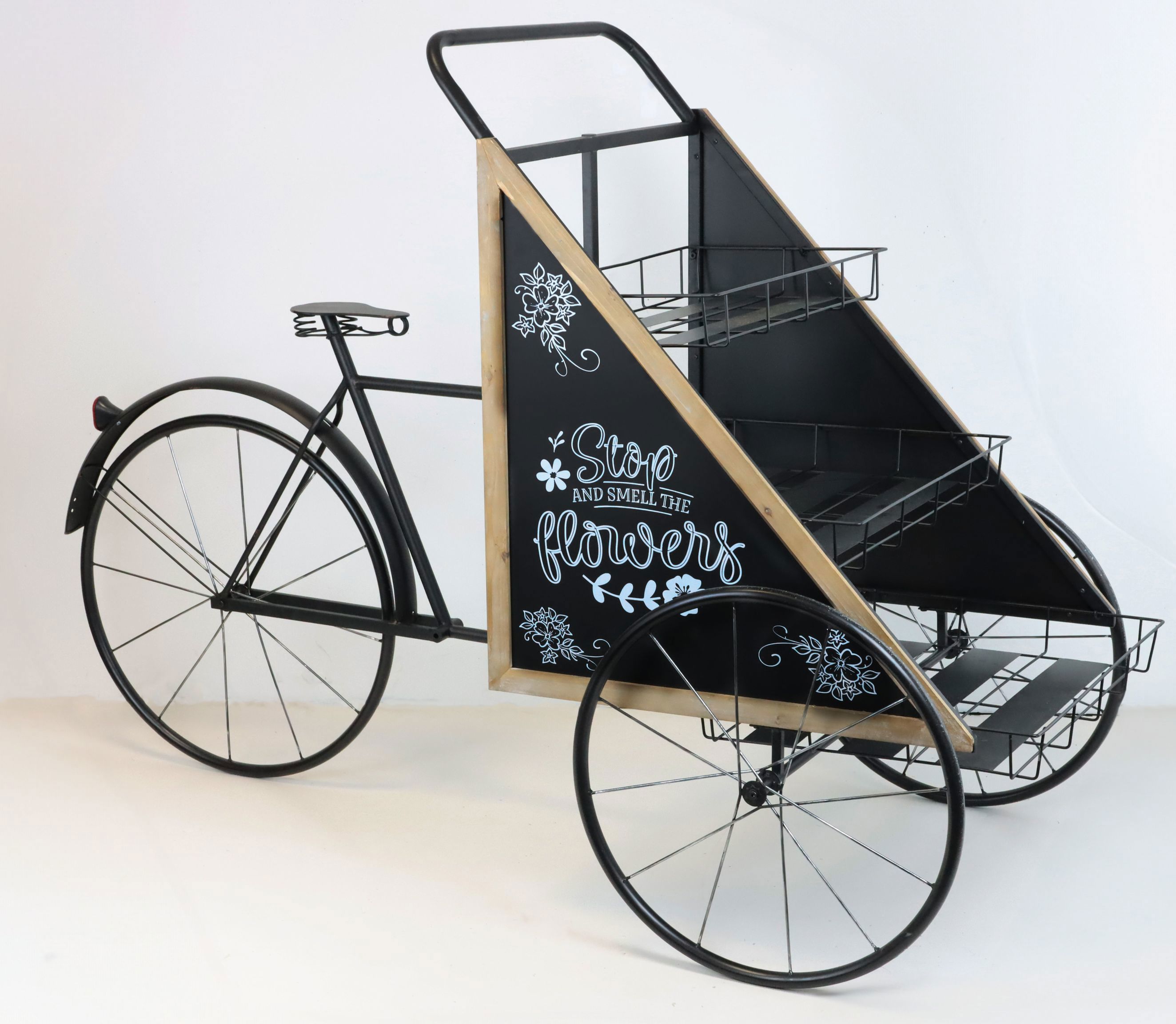 Faites souffler un vent de fraîcheur sur votre commerce de détail avec notre Flowerbike "AMSTERDAM". Ce vélo à fleurs unique, inspiré par le charme de la capitale néerlandaise, apporte une touche particulière à chaque emplacement. Le vélo est habillé d'un noir élégant et fabriqué à partir de matériaux robustes comme le fer et le bois. Avec une longueur impressionnante d'environ 175 cm, il offre une surface généreuse pour disposer des fleurs et des plantes de manière artistique et ainsi captiver vos clients dès leur entrée dans votre magasin.