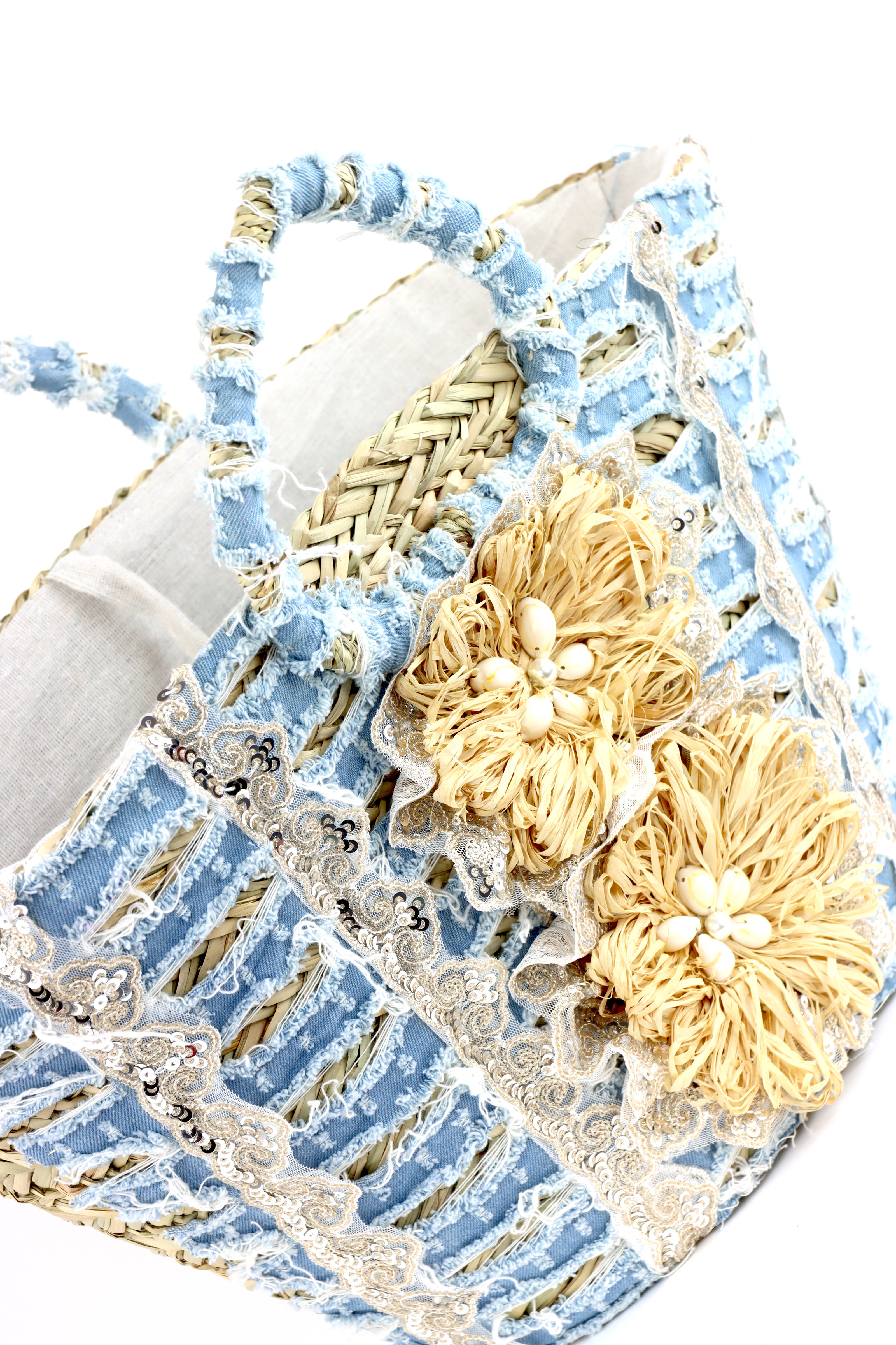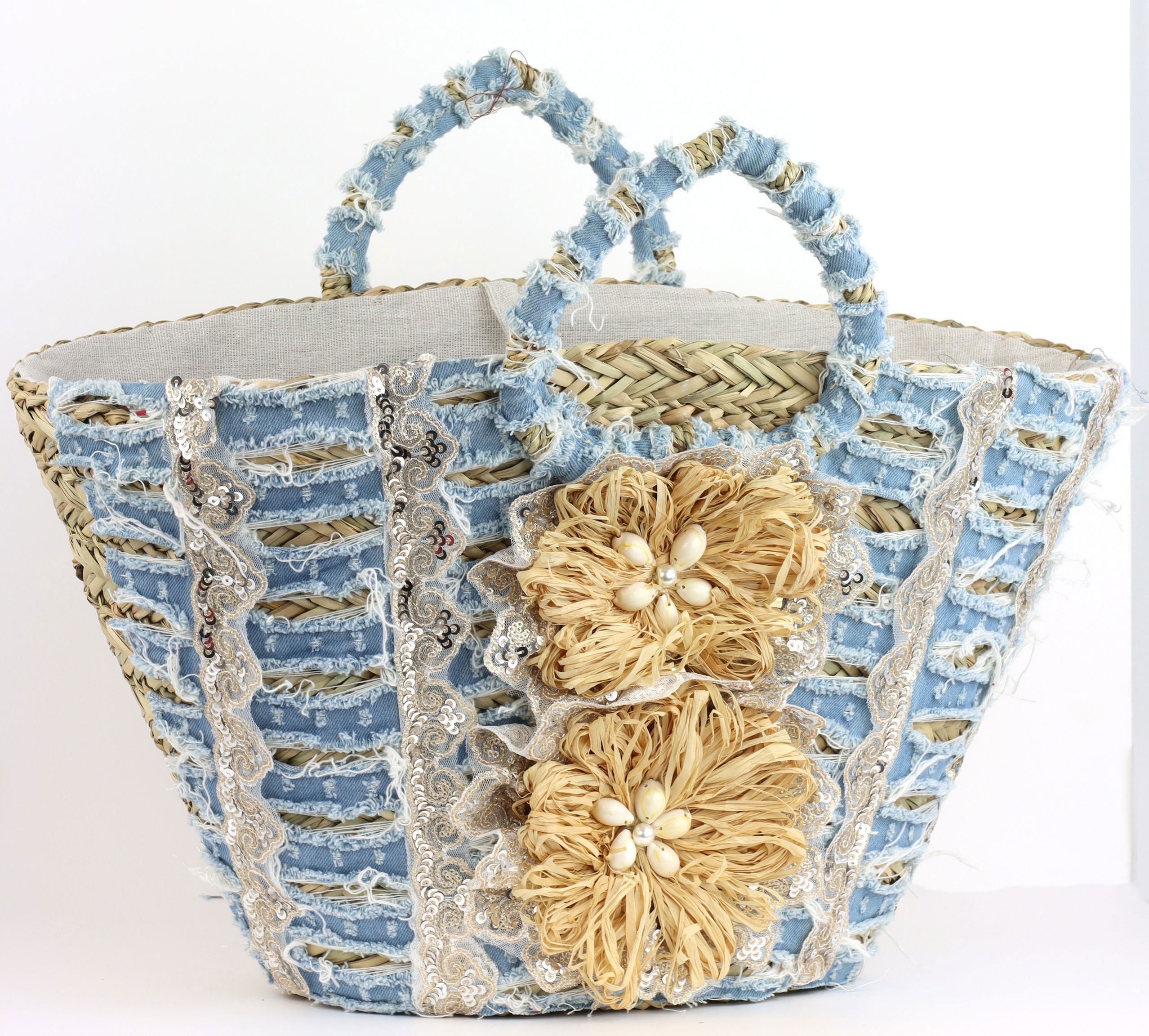 **Texte du produit pour le sac en osier "Denim Diva "**