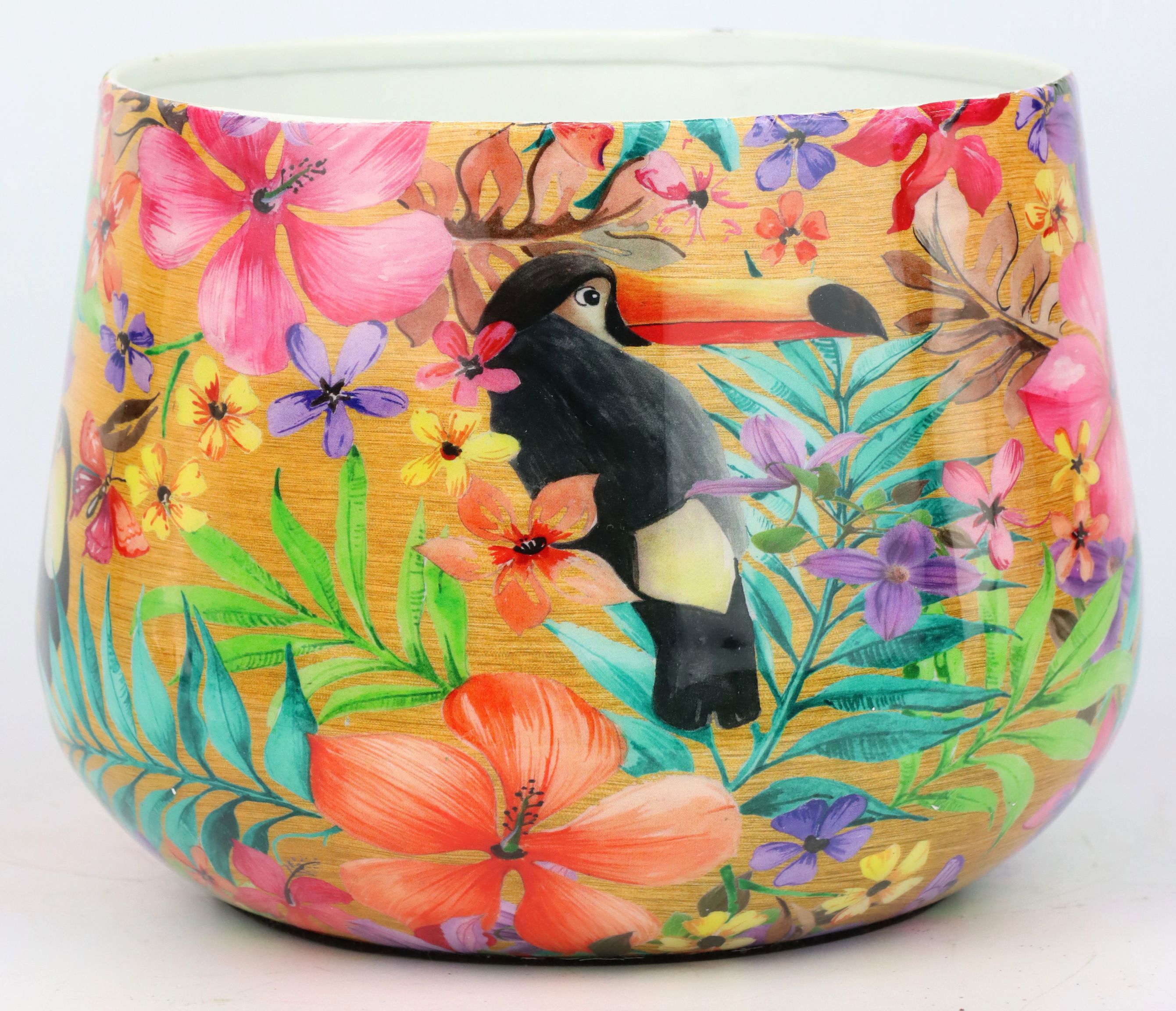 Con un diametro di circa 15 cm, questa fioriera offre spazio sufficiente per esporre con stile le vostre piante preferite. Il design elaborato presenta il motivo di un uccello del paradiso, che aggiunge un tocco di esotismo e vivacità a qualsiasi ambiente. I colori eleganti e il design dettagliato piaceranno ai clienti alla ricerca di un pezzo decorativo accattivante ed elegante.