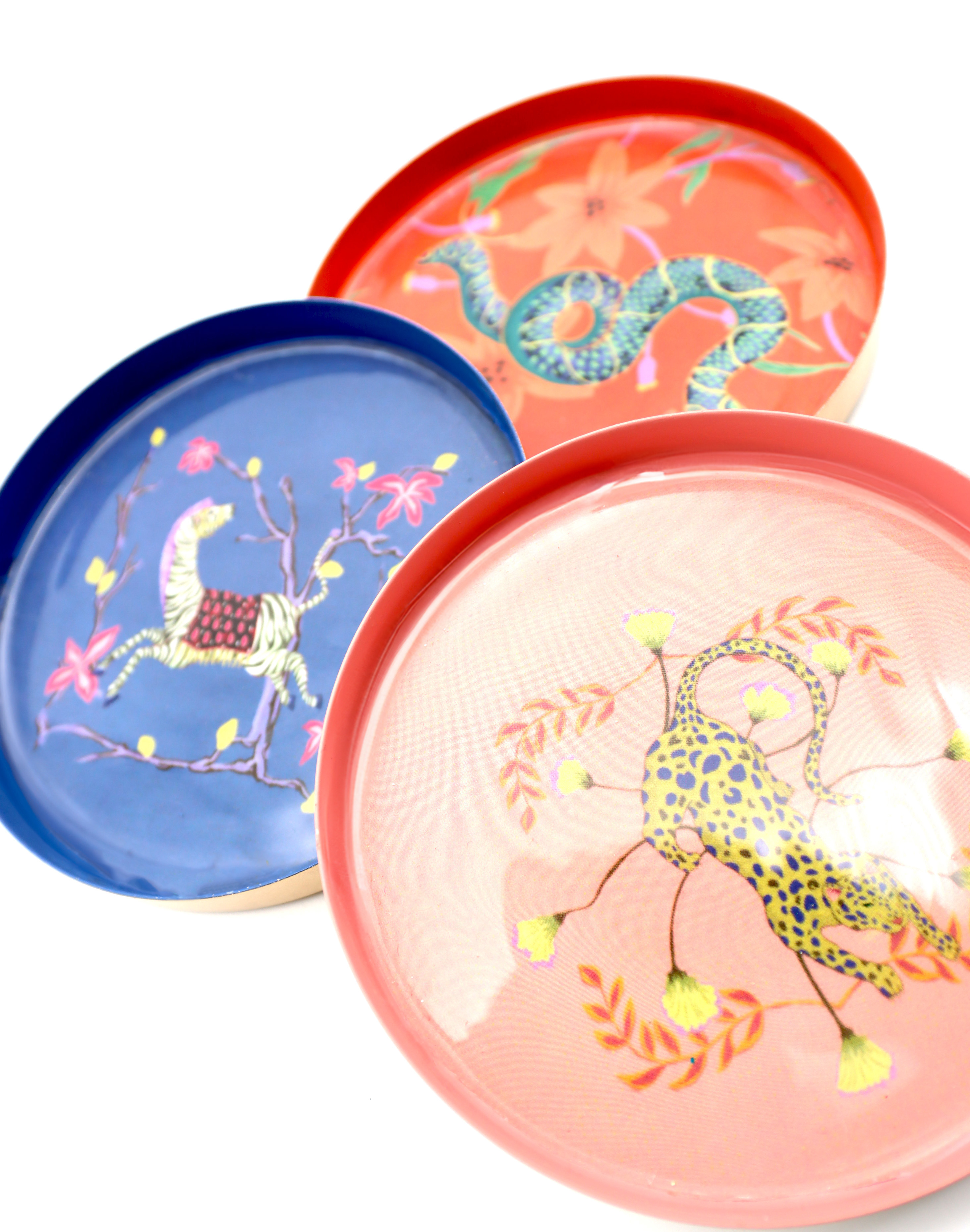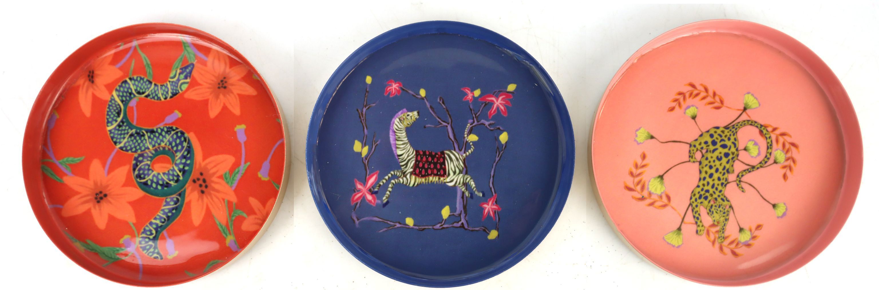I piatti sono caratterizzati da un design artistico in stile asiatico, che incorpora motivi animali come serpenti, zebre e leopardi. Gli intensi contrasti di colore tra il rosso e il blu sottolineano l'insolito design di questi piatti decorativi. Grazie a questa tavolozza di colori unica, i piatti possono essere integrati meravigliosamente in stili di interni sia moderni che classici.