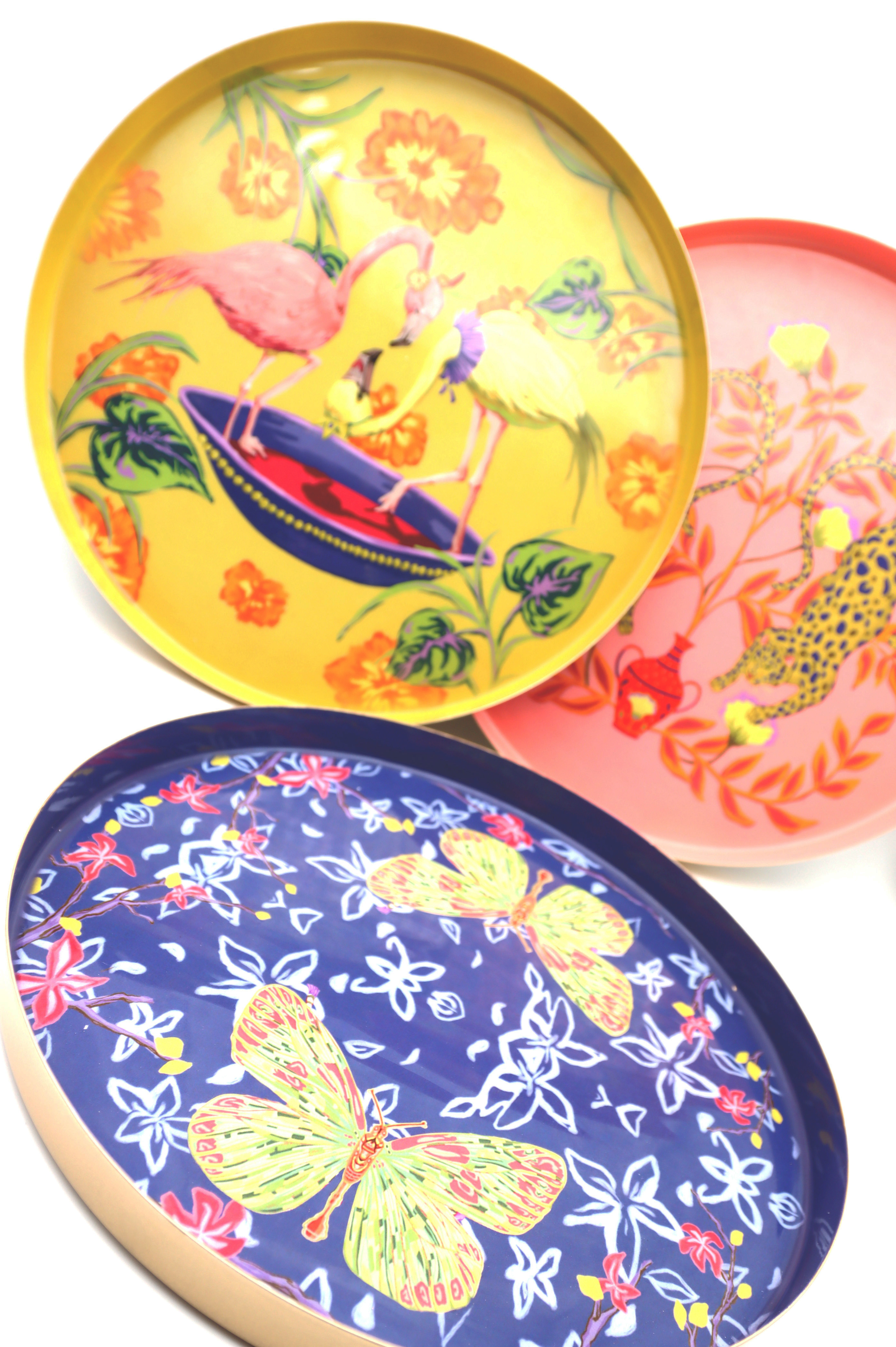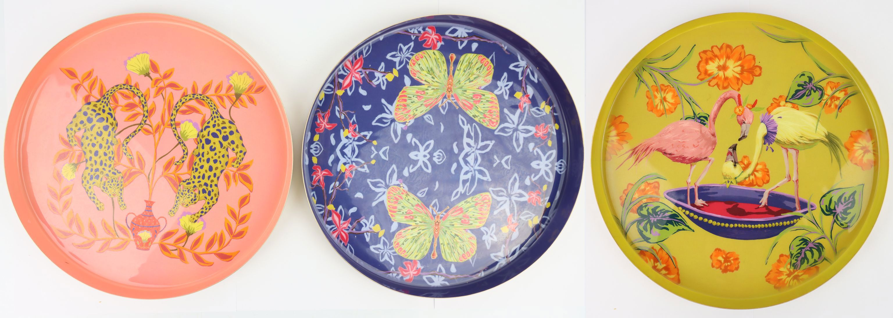 Ogni vassoio di questo set è un'opera d'arte in sé, ispirata alla ricca fauna asiatica. La palette di colori corallo, blu e giallo conferisce a ciascun vassoio un carattere unico e vibrante. Realizzato in metallo robusto con un diametro di 25 cm, questo set non è solo robusto, ma anche facile da maneggiare e versatile. I vassoi convincono per la loro altissima qualità e per il loro look straordinario, che non mancherà di attirare l'attenzione di tutti.