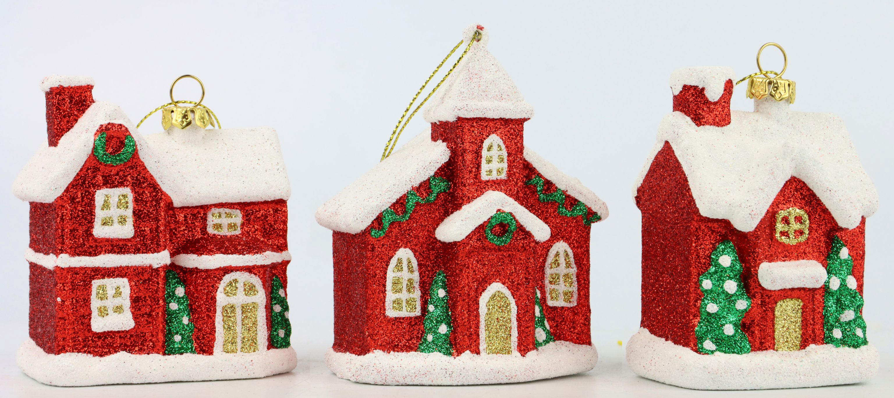 Parole chiave: ornamenti decorativi "case", decorazione natalizia, set di 3, plastica di alta qualità, glitter, idea regalo, casa e lifestyle, Natale, vendita al dettaglio.