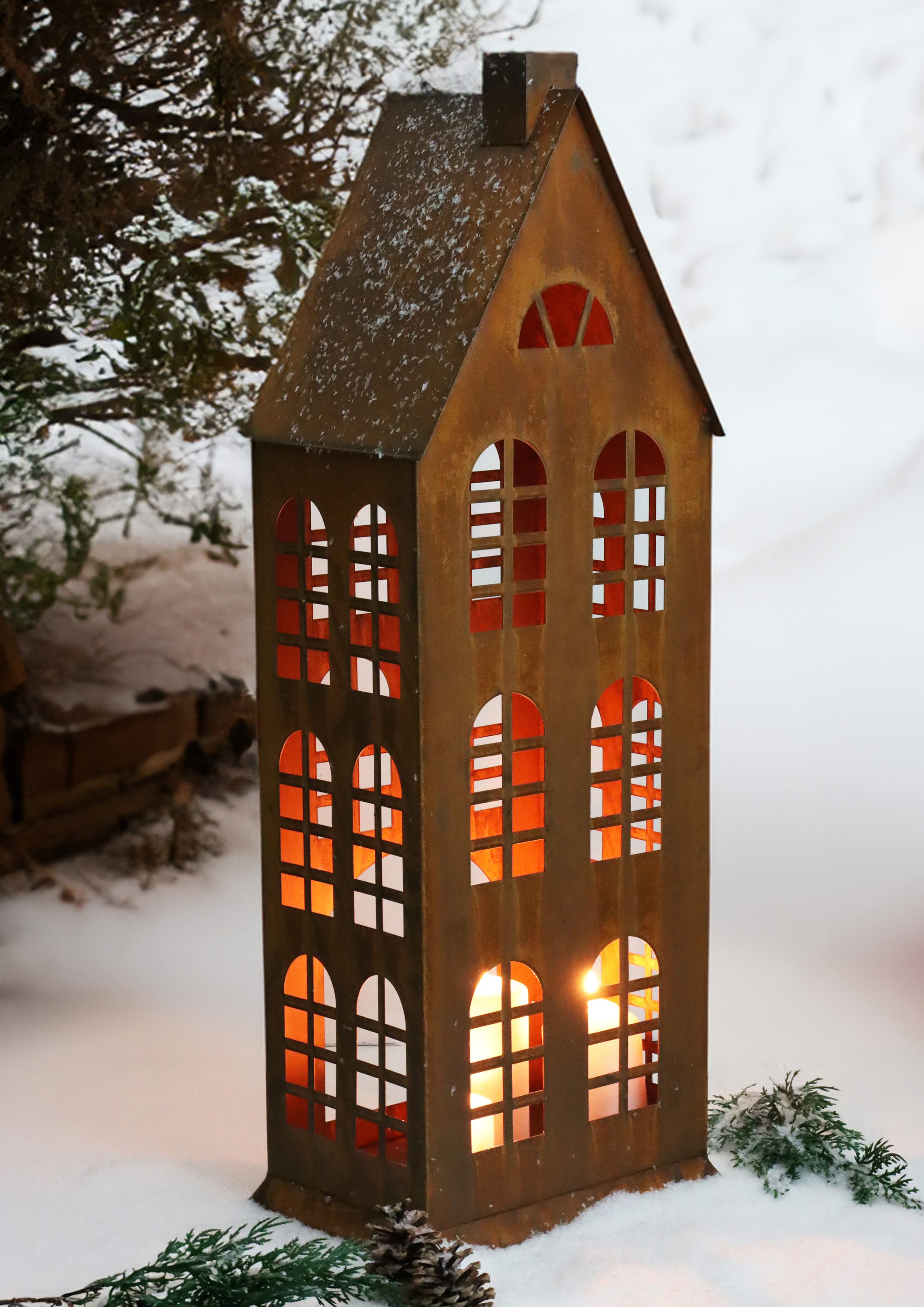 La casetta per lanterne "La Ville" è realizzata in robusto ferro antiruggine e misura ben 90 cm di altezza. Questa elegante lanterna si adatta perfettamente a qualsiasi ambiente abitativo e crea accenti suggestivi, indipendentemente dal design degli interni. Che sia rustico, moderno o minimalista, questo pezzo decorativo di alta qualità offre quel qualcosa in più.