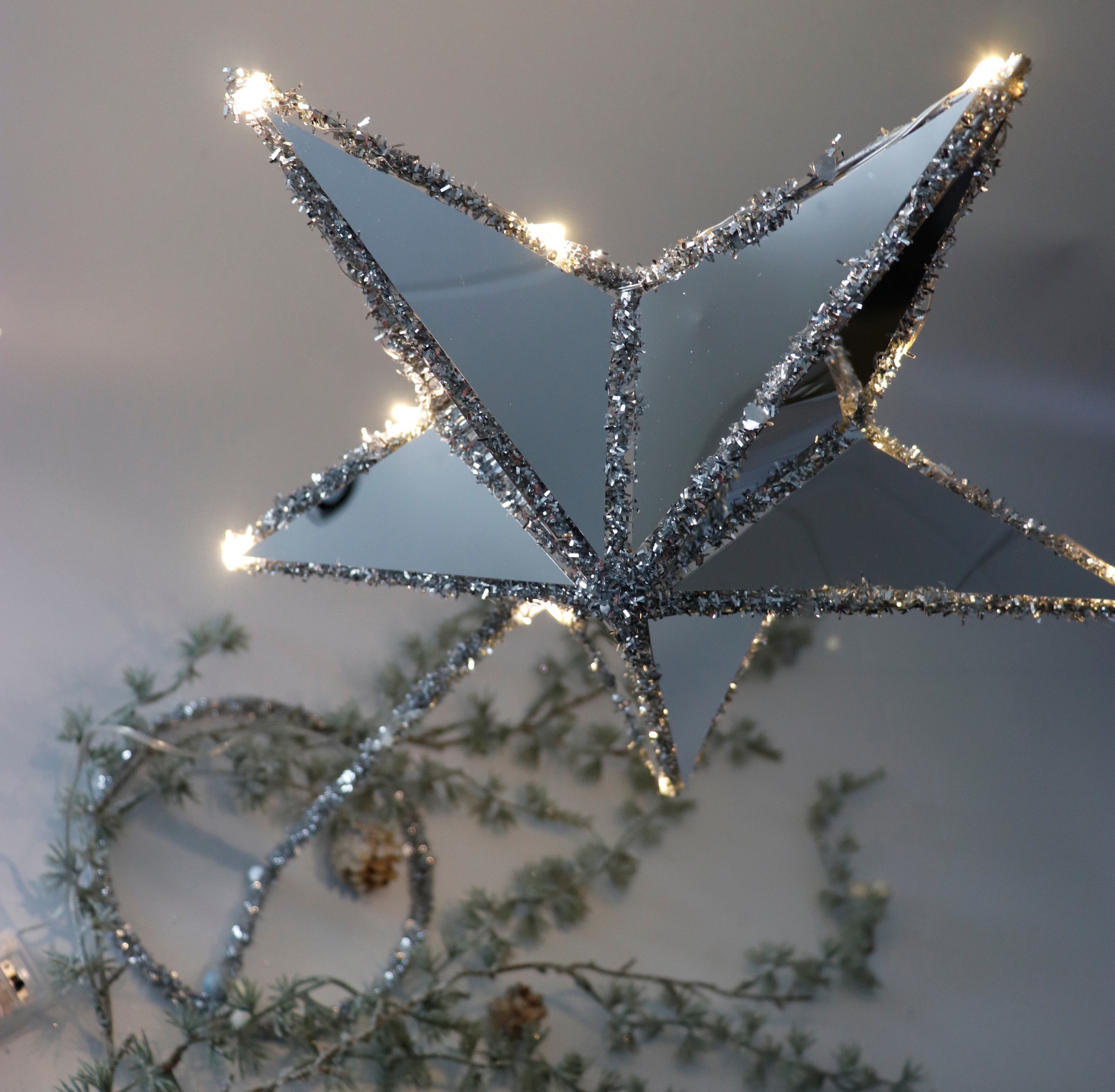 Il set è composto da due stelle illuminate dal design artistico di circa 50 cm e 70 cm. La combinazione di metallo di alta qualità, plastica resistente e poliestere pregiato conferisce alle stelle un aspetto elegante. La superficie riflettente e l'elegante bordo argentato creano accenti eleganti che conferiscono un'atmosfera festosa a qualsiasi ambiente.
