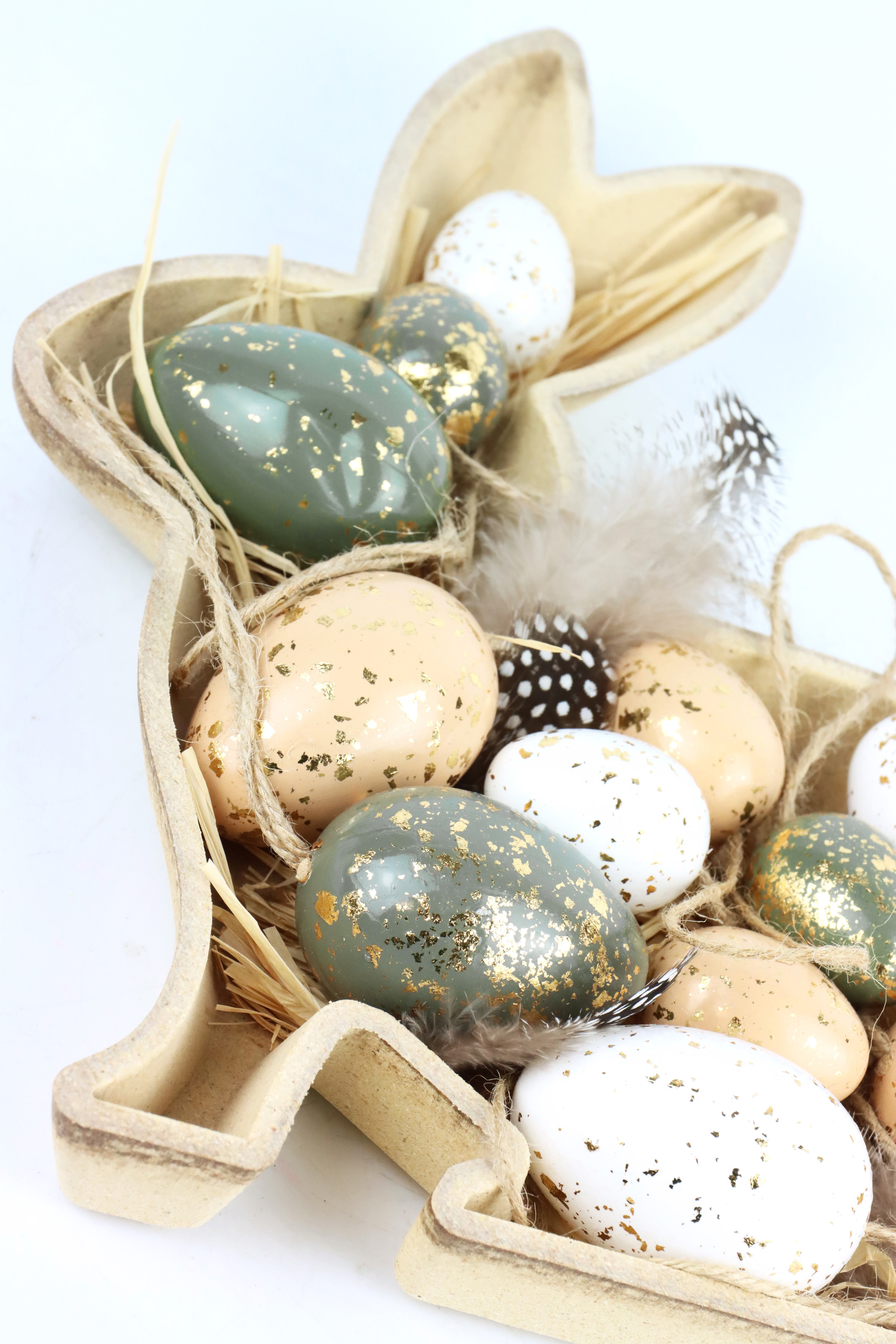 La ciotola è corredata da dodici uova accuratamente disegnate in due dimensioni (circa 6 cm e 5 cm) per aggiungere il tocco finale alla vostra decorazione. Realizzate in legno e plastica, queste uova offrono un aspetto autentico ma resistente, ideale per essere riutilizzate negli anni a venire. Ogni uovo emana un fascino sobrio che si adatta perfettamente ad ambienti moderni e classici.