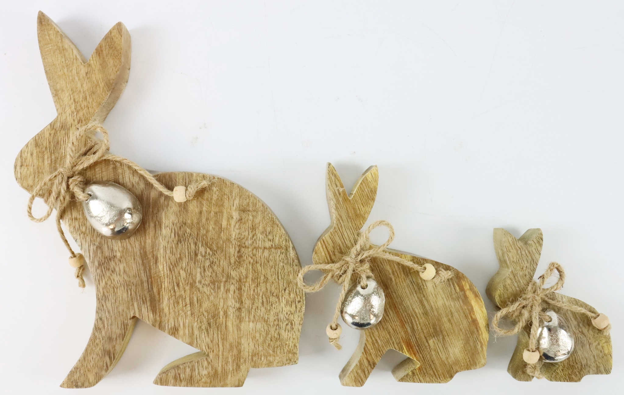 Scoprite l'affascinante WOODEN BUNNY "TRIO" S/3 in legno di mango di alta qualità, che conferirà al vostro negozio di Pasqua uno speciale fascino rustico. Questo set decorativo è composto da tre figure di coniglietti dal design individuale che misurano 24 cm, 15 cm e 10 cm. Il colore naturale del legno di mango ne enfatizza l'estetica e si inserisce meravigliosamente in qualsiasi ambiente casalingo, sia per la vendita al dettaglio nel settore della casa e del lifestyle che per le presentazioni speciali di Pasqua.