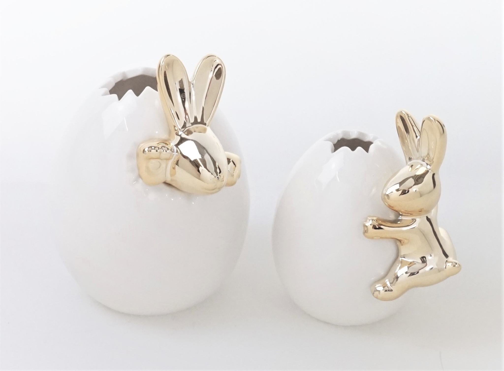 Il set è composto da due vasi per uova di dimensioni diverse: Il vaso più piccolo misura 9,2 cm e il vaso più grande 11 cm, entrambi idealmente proporzionati per essere collocati su tavoli, mensole o credenze. L'elegante finitura dorata di questi vasi in porcellana conferisce loro un aspetto sofisticato che può essere interpretato sia in modo tradizionale che moderno.