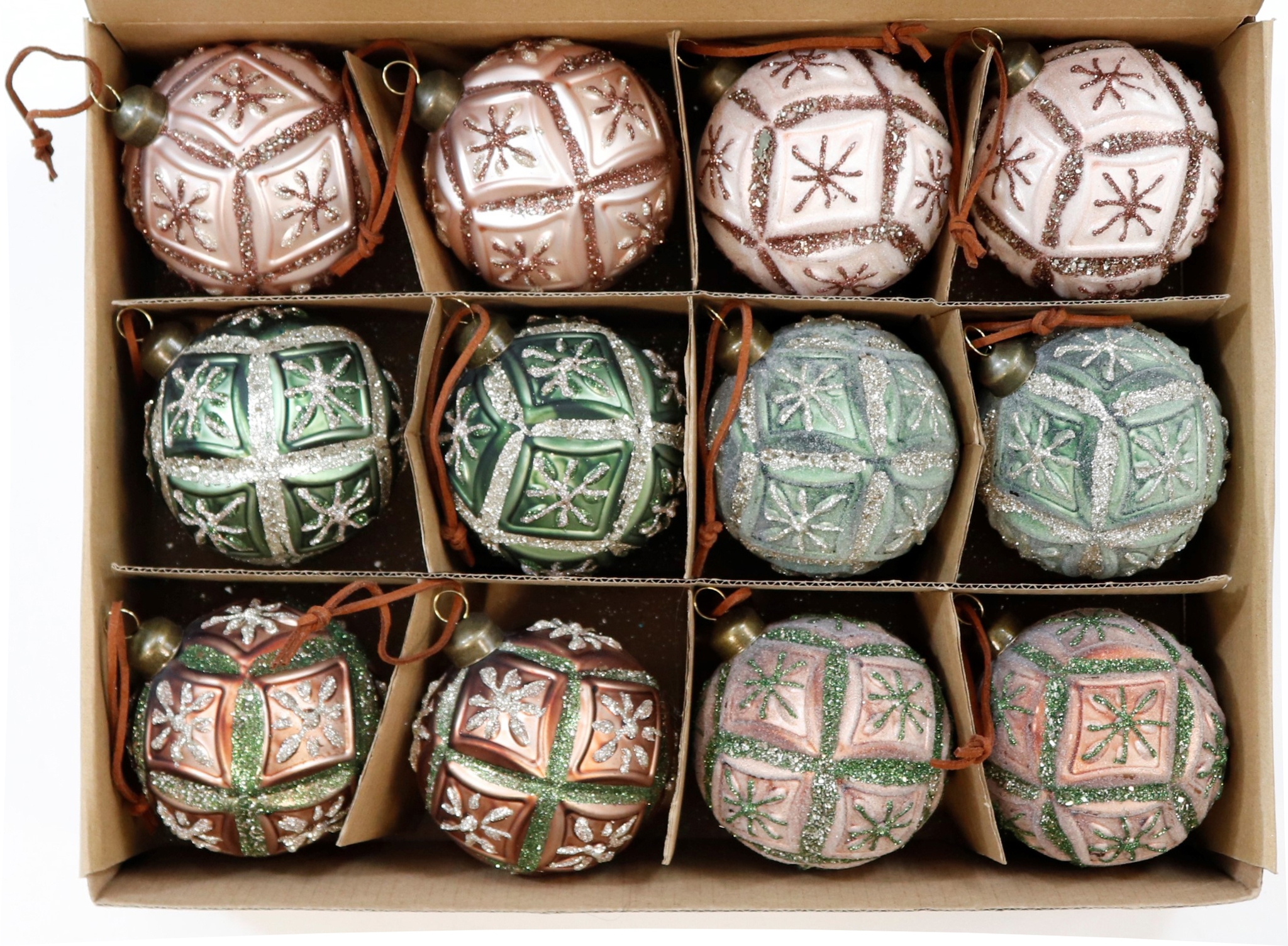 - Un set di 12 pezzi di palline di vetro dal design accattivante, confezionate in un'elegante scatola.